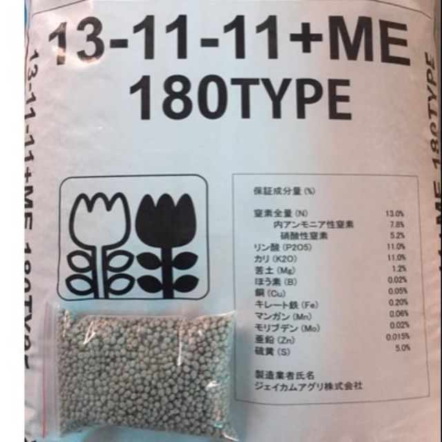 Gói 1kg phân tan chậm Nhật Bản 13-11-11 ME tốt cho mọi cây trồng.Đây là loại phân hóa học tổng hợp được bao bọc bởi một lớp vỏ đặc biệt có tác dụng hòa tan có kiểm soát các thành phần dinh dưỡng. Lớp vỏ này cho phép nước thẩm thấu vào bên trong cũng như cho phép các thành phần dưỡng chất bên trong được giải phóng vào trong đất. Tùy theo mục đích sử dụng mà lớp vỏ này được điều chỉnh để khống chế thời gian giải phóng chất dinh dưỡng vào đất. Hiện tại có 7 chủng loại phân bón của dòng sản phẩm này được bán trên thị trường với thời gian kiểm soát khác nhau là: Type 40, Type70, Type 100, Type 140, Type 180, Type 270 và Type 360. Các con số chỉ ra số ngày tiêu chuẩn mà phân bón sẽ giải phóng 80% lượng Ni-tơ dưới điều kiện nhiệt độ tiêu chuẩn (25 độ C). Ví dụ: Type 40 là loại phân bón có khả năng giải phóng 80% hàm lượng Ni-tơ bên trong, trong vòng 40 ngày dưới điều kiện nhiệt độ tiêu chuẩn là 25 độ C.