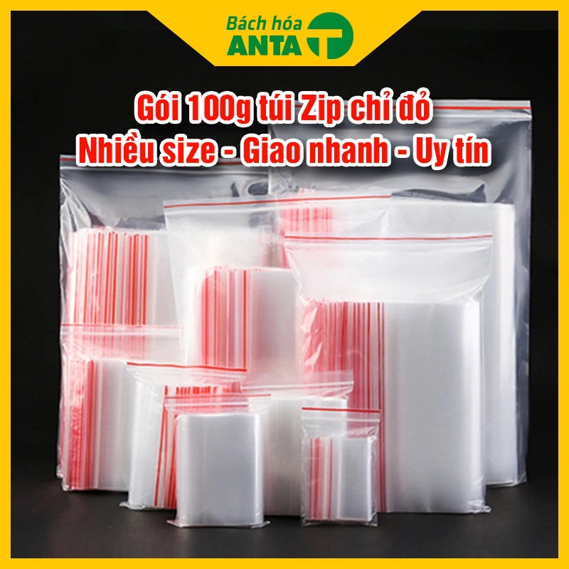 Giới thiệu 100g Túi zip chỉ đỏ loại dày đẹp - Ấn vào chọn size - (bịch PE vuốt mép đựng phụ kiện, gia vị, thực phẩm)