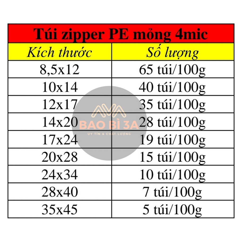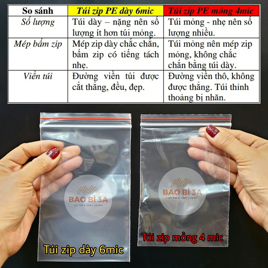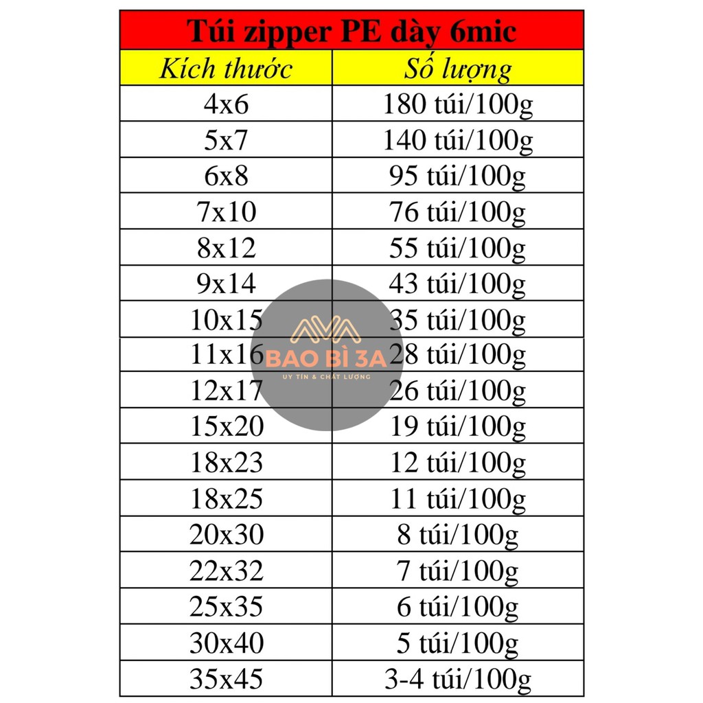- Túi zip mỏng nhẹ thì sẽ nhiều túi hơn túi zip dày nặng, nên tùy từng chất túi mỗi đợt hàng thì số lượng cũng khác nhau. Số lượng trên bảng size chỉ là ƯỚC LƯỢNG, trên thực tế có thể chênh lệch.