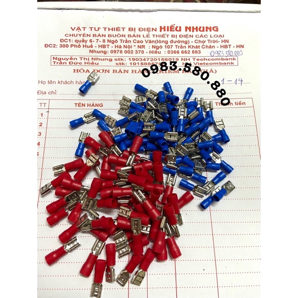 Đầu cos là thiết bị kết nối trong ngành điện, có chức năng tăng khả năng dẫn điện giữa cáp điện và cáp điện hoặc cáp điện và thiết bị. Đây là sản phẩm quen thuộc của người thợ điện, thở sửa chữa máy móc trong việc đấu nối dây điện, tủ tiện, kết nối dây trong hệ thống điện, máy móc, thiết bị, ...CÔNG CỤ TỐT phân phối Túi 100 đầu cos ghim capa cái FDD5- 250 bọc nhựa xanh, đỏChất liệu: Nhựa PVC và nhôm.