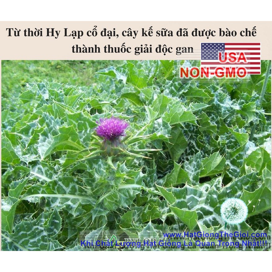 Kế Sữa Gan - Milk Thistle (Silybum marianum) to 1,2m đến 3m; lá lớn có chấm hoặc gân màu trắng (Kế Sửa); bông màu đỏ tím to 5 cm; trái nhỏ, có vỏ cứng màu nâu bóng với nhiều chấm. Tất cả bộ phận của cây đều ăn được. Trà làm từ cây kế sữa đã được sử dụng cho việc điều trị các bệnh về gan trong thời cổ đại. Nghiên cứu khoa học gần đây chỉ ra chất Silymarin Hoa cây kế sữa nở từ tháng 6 đến tháng 8, các hạt màu đen được thu hoạch vào cuối mùa hè để sử dụng cho các mục đích y học.Thông tin về Hạt Giống Kế Sữa Gan - Milk Thistle (Silybum marianum)
