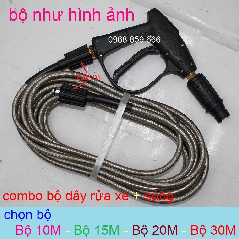 Bộ 10m,15m,20m,30m dây rửa xe và súng xịt - súng rửa xe áp lực cao ren 22mm (dây ren 22mm +súng đen )