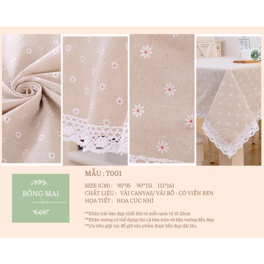 Khăn trải bàn vải canvas VIỀN REN họa tiết HOA CÚC nhí phong cách Nhật Bản nhẹ nhàng vintage [T001]Khăn được sử dụng với nhiều công dụng : khăn trải bàn trà, trải bàn làm việc, trải sofa decor phòng, thảm picnic, phụ kiện chụp ảnh.