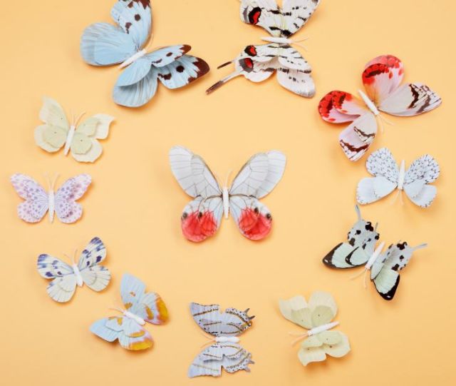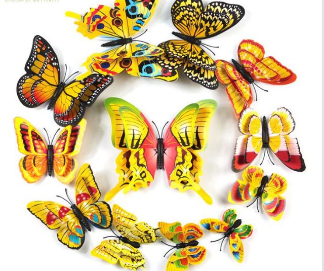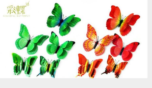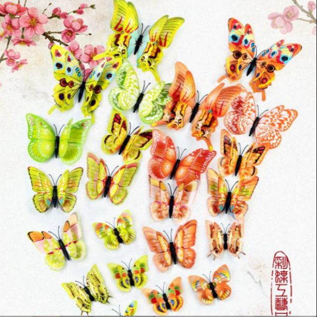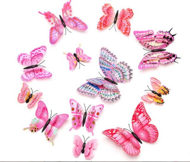 1 túi bướm 3D 4 cánh gồm 12 con có các kích thước khác nhau từ 6 đến 12cm có cùng 1 màu sắc.Com bướm được làm bằng in phim và có thể được đặt ngoài trời, sân vườn hoặc ban công.