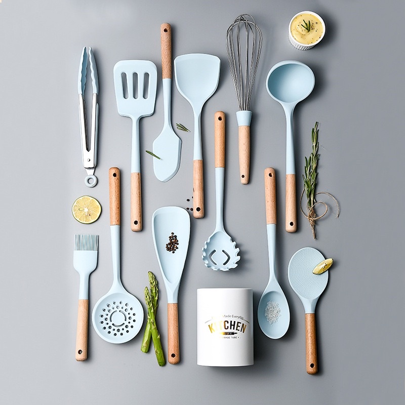 🌿 Bộ dụng cụ bao gồm 12 món + một chậu đựng: đánh trứng, quét dầu, kẹp, phết bơ, muỗng múc mỳ spaghetti, xẻng lật, xẻng lật có lỗ, muỗng, muỗng lỗ, thìa to, thìa lỗ.