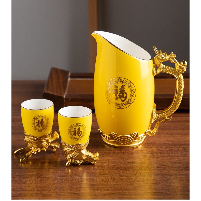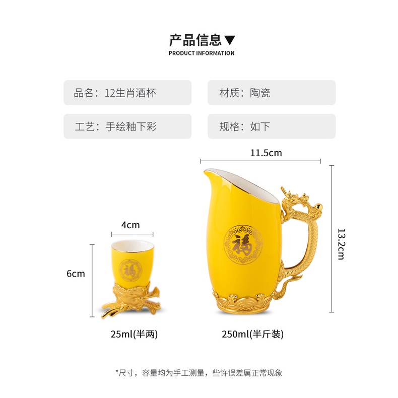 Một bộ gồm 12 ly biêtu hiện cho 12 con giáp Châu âu + 1 bình tay cầm họa tiết rồng Kích thước: 45 x 20 x 20 cm Bộ ly có thể dựng đứng được chắc chắn.