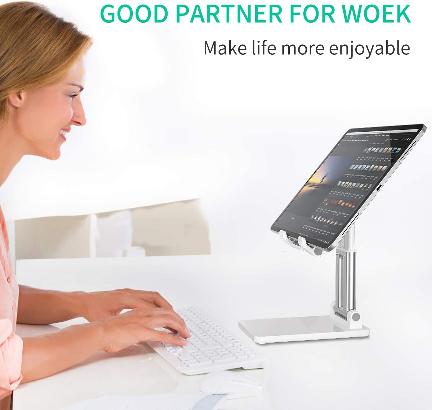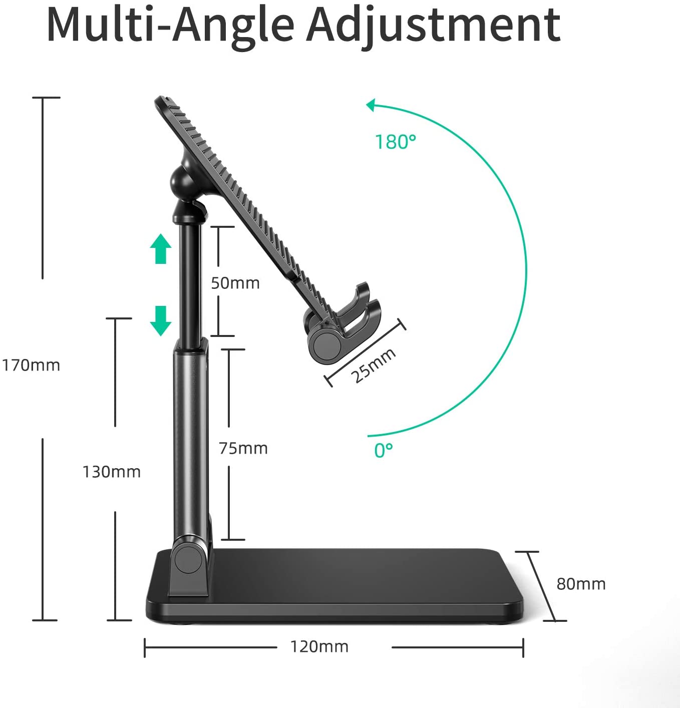 Độ ổn định và khả năng bảo vệ tuyệt vời: Chân đế máy tính bảng được cấu tạo bởi đế trọng lượng bằng kim loại cực kỳ chắc chắn và các cọc nhôm kép chất lượng cao, đủ chắc chắn để giữ điện thoại di động và máy tính bảng của bạn. Tải trọng có thể lên đến 641g! Đệm bọc silicone và các móc cao su đảm bảo điện thoại hoặc máy tính bảng của bạn được cố định chắc chắn và tránh trượt và trầy xước. Khi bạn gõ nhẹ vào thiết bị, các chân cao su dưới đế giúp thiết bị ổn định hơn.Điều chỉnh đa góc và độ cao: Giá đỡ máy tính bảng có thể điều chỉnh thông qua thiết kế tiện dụng này, góc và chiều cao của giá đỡ điện thoại di động để bàn này có thể được điều chỉnh để giúp bạn tìm được góc phù hợp để phơi bày toàn bộ khuôn mặt của mình cho cuộc gọi điện video / hội nghị. Chiều cao có thể được điều chỉnh từ 5,12 đến 6,7 inch, góc của mặt sau của giá đỡ trên có thể được điều chỉnh từ 0 đến 180 độ và thanh đỡ có thể được điều chỉnh từ 0 đến 90 độ.
