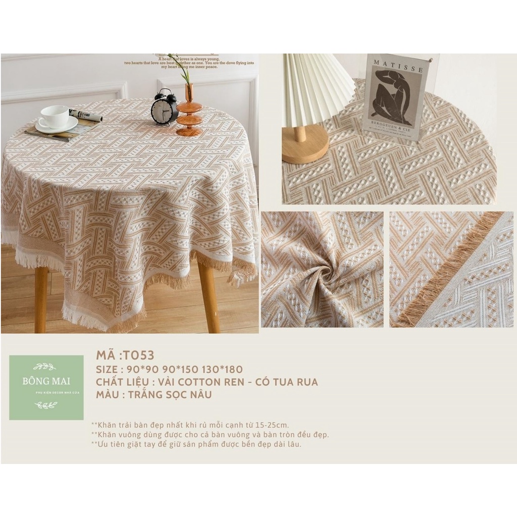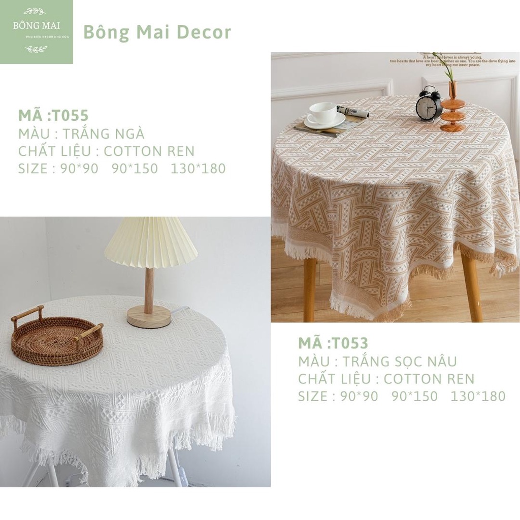 Khăn trải bàn ren cotton viền tua rua phong cách vintageKhăn được sử dụng với nhiều công dụng : khăn trải bàn trà, trải bàn làm việc, trải sofa decor phòng, thảm picnic, phụ kiện chụp ảnh.