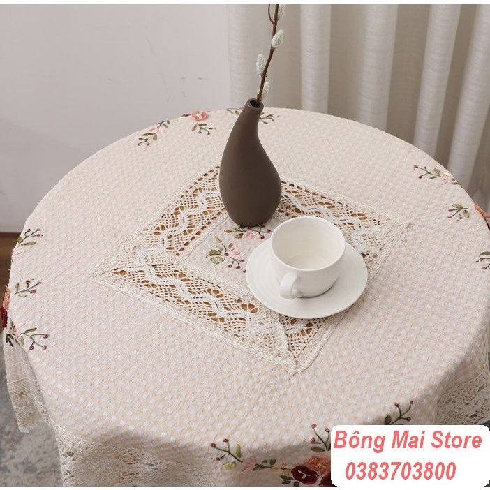 [130*180cm] Khăn trải bàn vải cotton phối ren, hoạ tiết thêu nổi phong cách vintage sang trọng [T049]