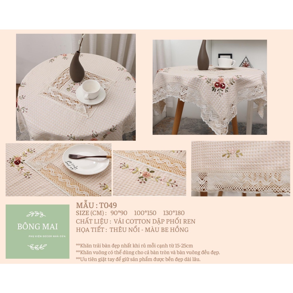 Khăn trải bàn vải cotton phối ren hạ tiết thêu nổi phong cách vintage sang trọngKhăn được sử dụng với nhiều công dụng : khăn trải bàn trà, trải bàn làm việc, trải sofa decor phòng, thảm picnic, phụ kiện chụp ảnh.