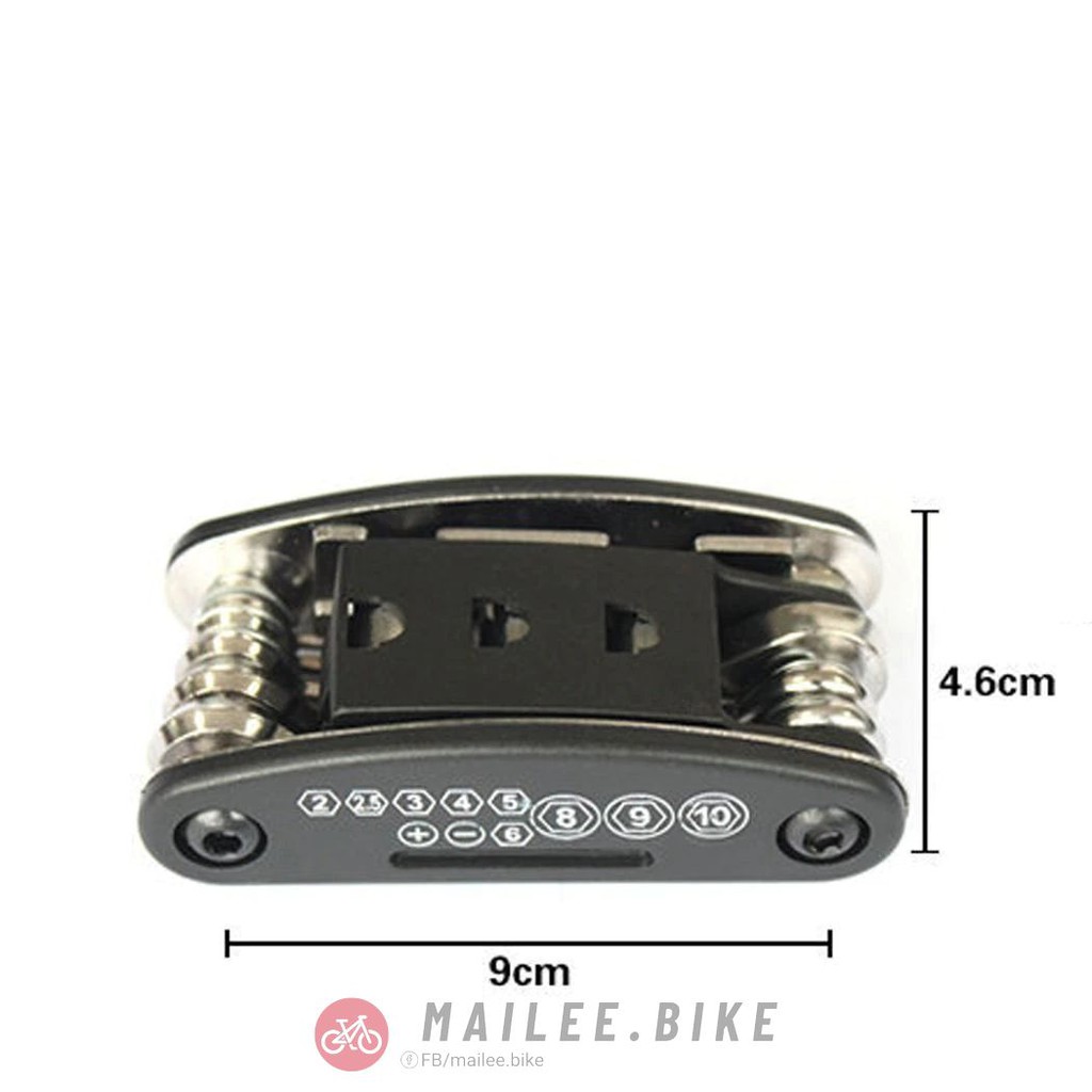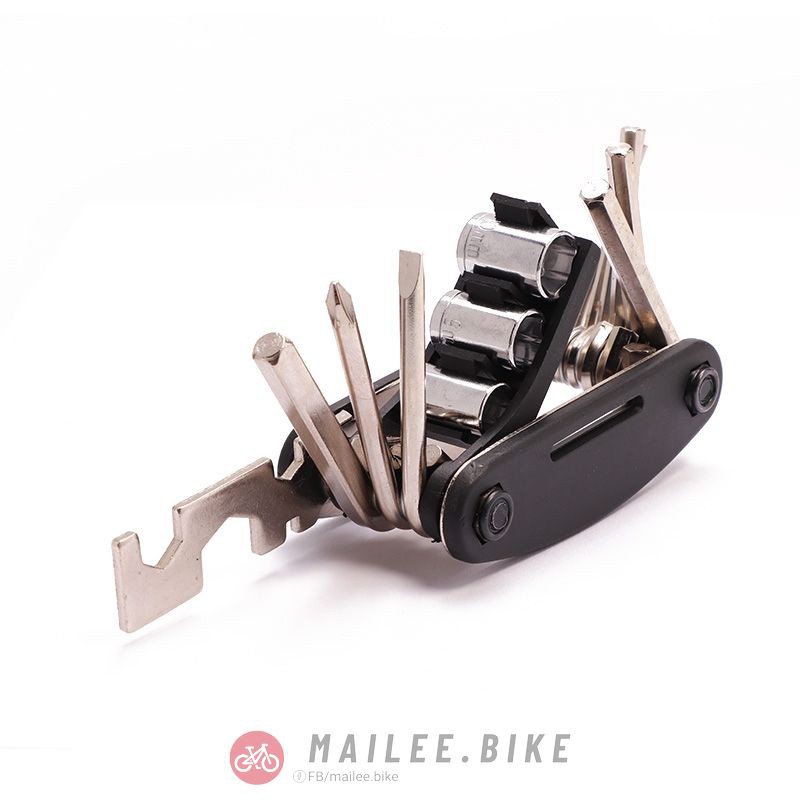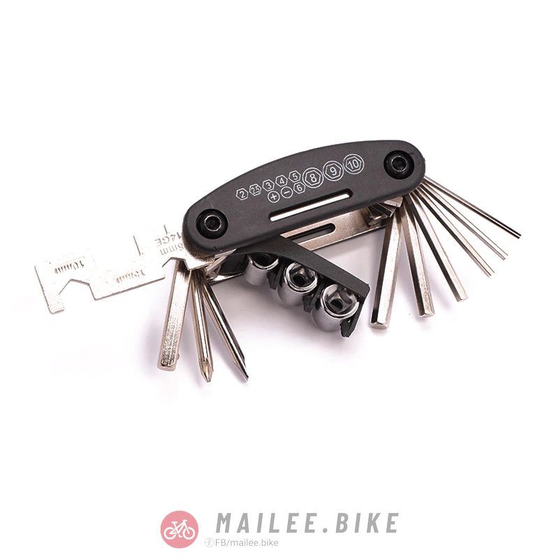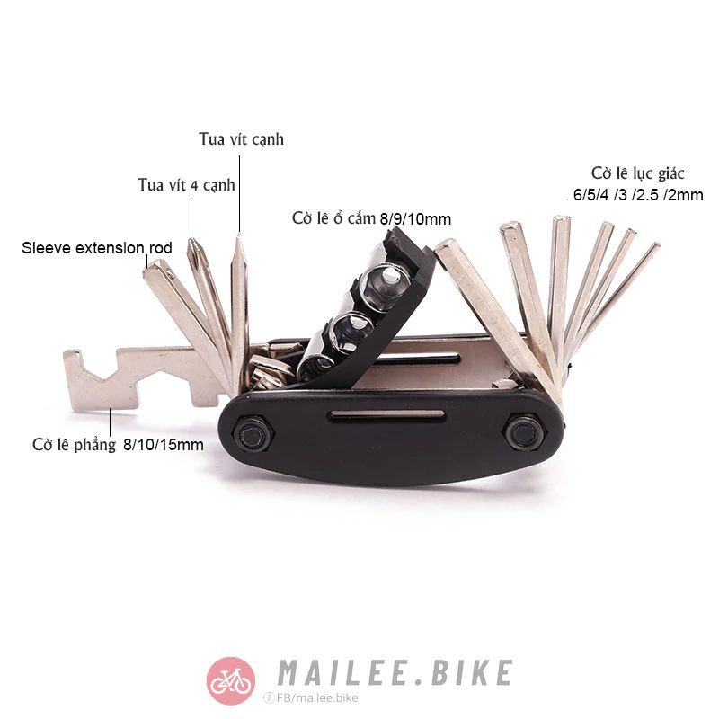 • Các dụng cụ chính: Dụng cụ sửa chữa xe đạp đa năng: Cờ lê lục giác 2 mm / 2,5mm / 3 mm / 4 mm / 5 mm / 6mm, cờ lê ổ cắm 8 mm / 9mm / 10 mm, tua vít, cờ lê phẳng 8 mm / 10 mm / 15mm