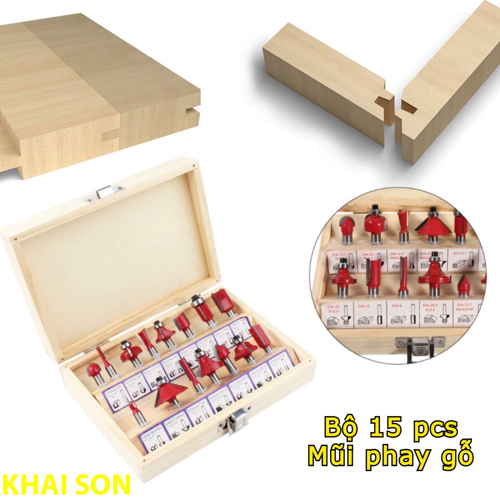 - Bộ mũi phay gỗ 15 món chuyên dùng cho máy phay cầm tay hoặc máy bàn router