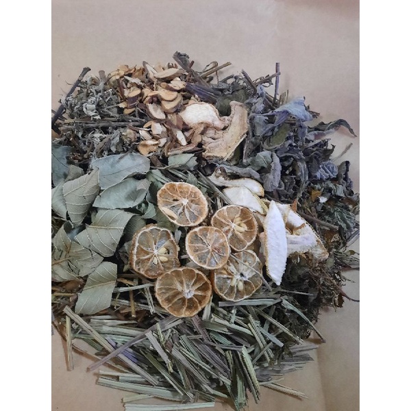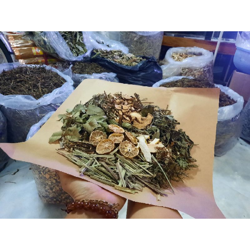 Hương nhu, vỏ bưởi, sả, ngải cứu, đinh lăng, lá sen, bạc hà, kinh giới, lá ổi, vỏ bưởi, lá trà xanh, chanh thái lát, quế chi, hoa nhàu và 1 số thảo dược khác.
