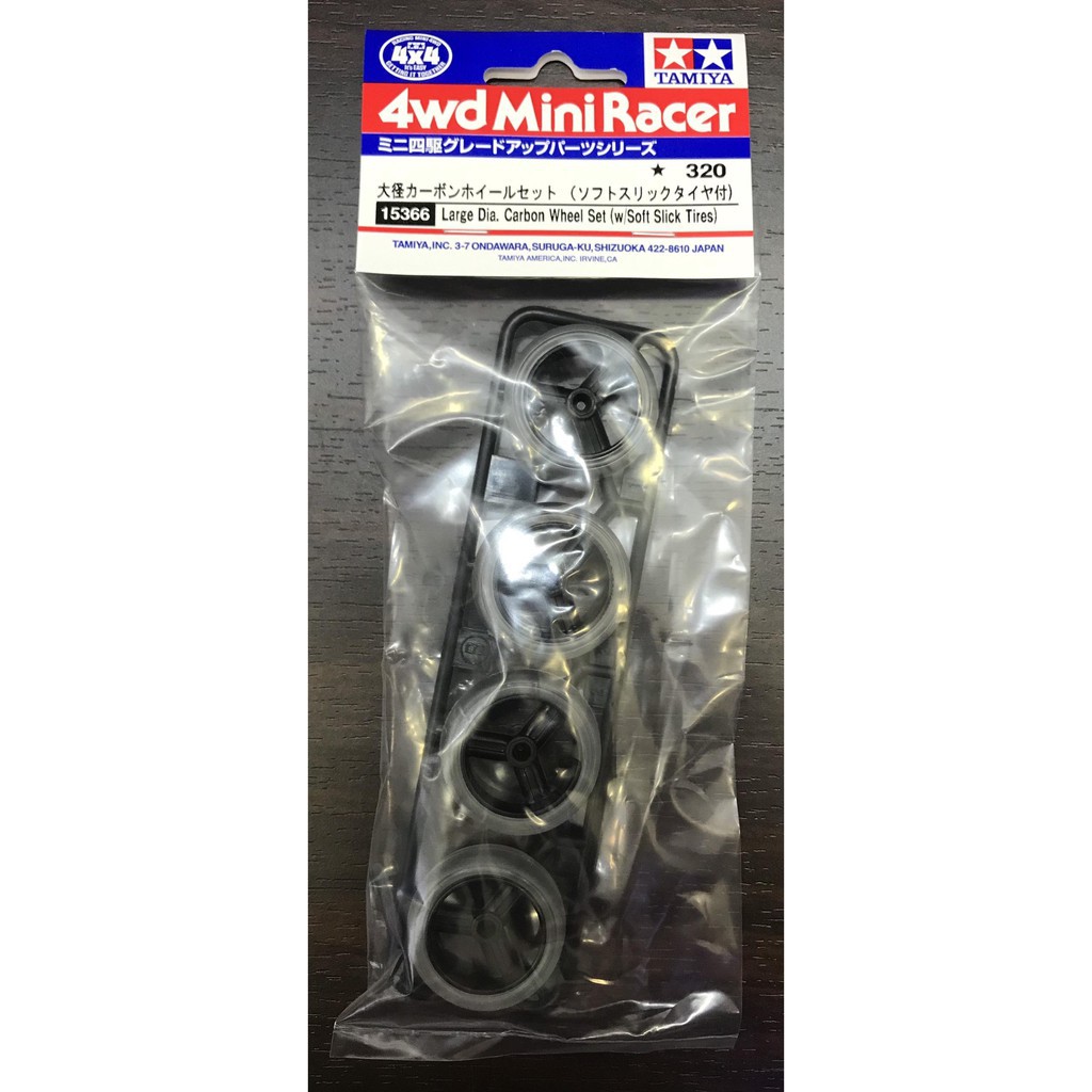 Lốp trơn mềm có độ bám cao được đặt trên bánh xe có đường kính lớn làm bằng nhựa nylon với sợi carbon có độ bền cao. Lốp xe trơn mềm trong suốt và bánh xe màu đen. Một cho mỗi hai phía trước và phía sau. Nó có thể được cài đặt trên Mini 4WD PRO, Racer, Super, Mini 4WD được trang bị lốp đường kính lớn.