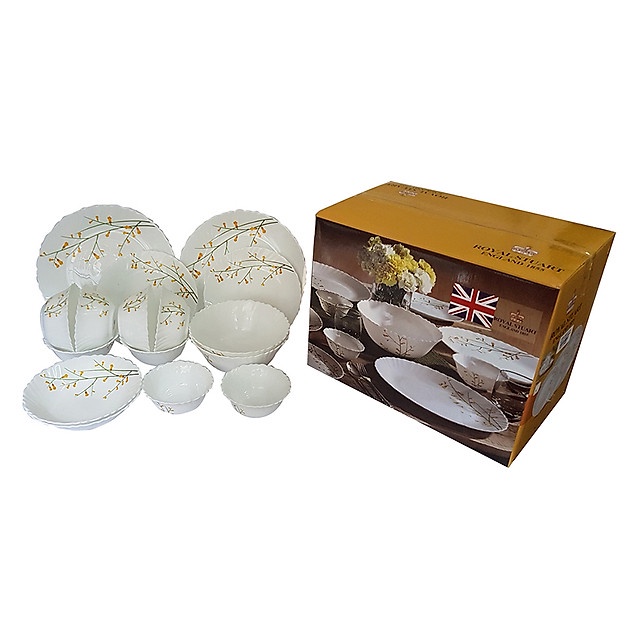 Thủy tinh ngọc Kháng vỡ Nhẹ, bền Dùng được trong lò vi sóng, máy rửa chén… An toàn, thân thiện Thiết kế đẹp mắt, sang trọng Hoa văn màu vàngBộ 16 món bát đĩa bằng thủy tinh ngọc Royal Stuart OPAL-B Hoa văn CITRON WEAVE gồm: