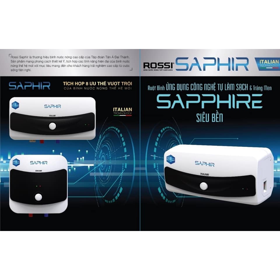 • Bình nóng lạnh Rossi Saphir được thiết kế bởi các chuyên gia hàng đầu từ Ý, kiểu dáng sang trọng và vô cùng tinh tế.