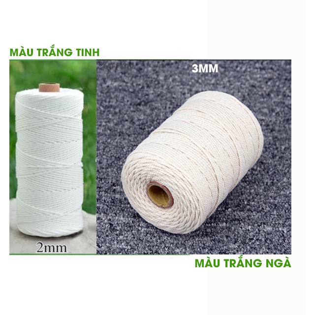 Dây macrame cuộn 2mm màu trắng được dùng nhiều trong việc đan giỏ, túi xách, làm rèm, cột tiền ngân hàng, decor tường hoặc nhà, sản phẩm được làm từ chất lượng cotton 100%- Màu sắc: trắng hoặc màu ngà