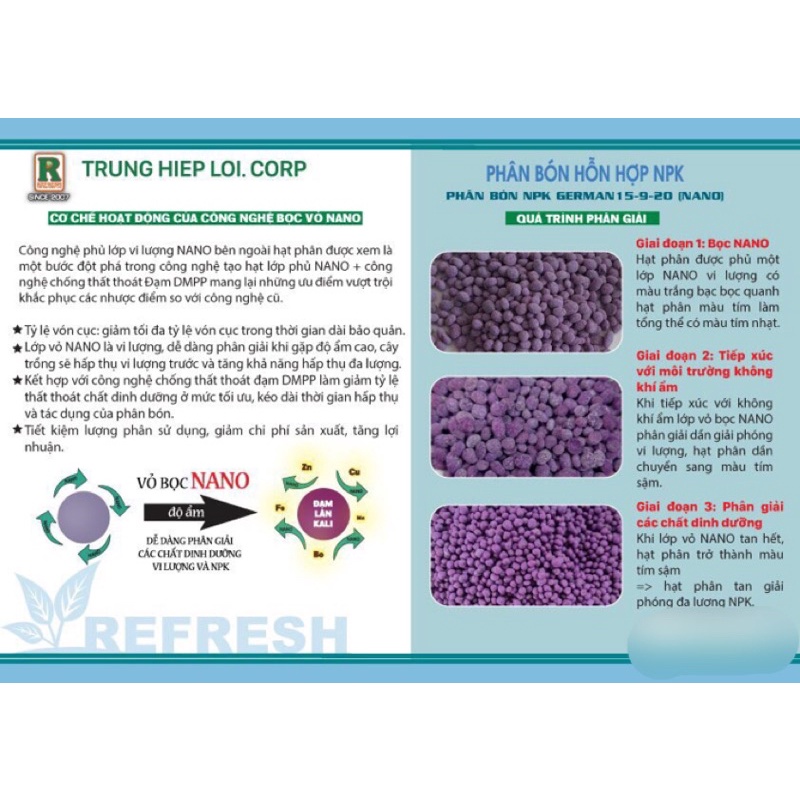 NPK GERMAN 15-9-20 (NANO) được phủ lớp vỏ Nano có màu bạc, sẽ đổi màu trong môi trường độ ẩm cao.