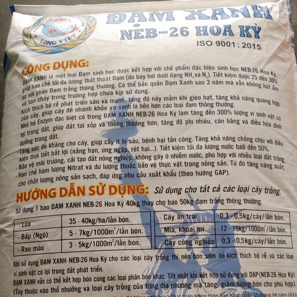 Phân Bón Đạm Xanh NEB-26 Hoa Kỳ (1kg)- Đạm Xanh ( ure+ neb 26 Hoa Kỳ), với chế phẩm sinh học NEB 26 là loại siêu phân bón được hãng AGMOR.INC Hoa Kỳ Nghiên cứu, được sản xuất theo công nghệ nano tiên tiến tại các Công ty phân bón hàng đầu của Mỹ. Chế phẩm sinh học siêu phân bón này chứa nhiều chất dinh dưỡng như: Các loại vi sinh vật hữu ích, chất hữu cơ, Lân, Kaly dễ tieu cùng một số nguyên tố trung và vi lượng thích hợp vớinhiều loại cây trồng nôngnghiệp.