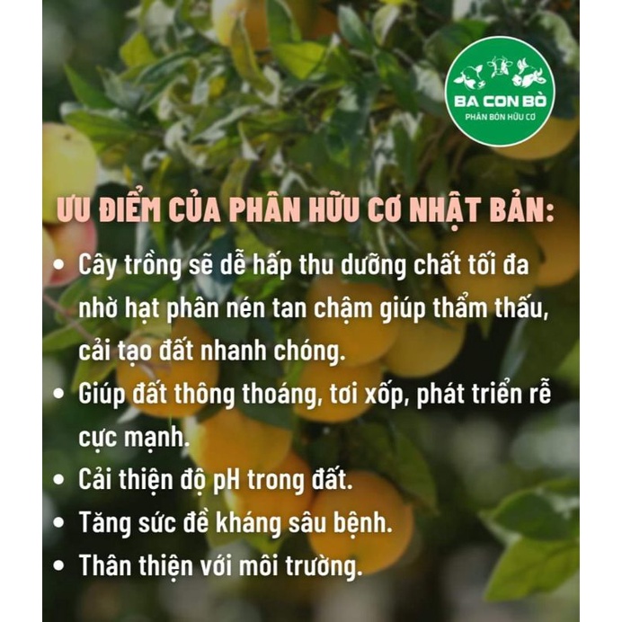 Phân Gà hữu cơ BA CON BO bổ sung hàm lượng hữu cơ và dinh dưỡng cao cho đất, cây trồng. Giúp cây trồng phát triển đồng đều, bền cây, chống lão hóa cây trồng. Phân Gà hữu cơ nhập khẩu Nhật Bản môi trường hữu cơ cho vi sinh vật có lợi phát triển; ức chế nấm bệnh trong đất như: phytophthora spp, pythium gây ra bệnh chết nhanh, chết chậm, tuyến trùng. Phân Gà hữu cơ Nhật Bản duy trì độ pH ổn định cho đất, tạo bộ rễ vững chắc. Nuôi dưỡng hệ vi sinh vật có lợi. Giúp đất tơi xốp, tăng độ phì nhiêu. Ưu điểm của phân hữu cơ Nhật Bản: Nhờ sự kết hợp giữa các thành phần Đạm; Lân; Kali; Canxi; Magie và các nguyên tố vi lượng Cu, Fe, Zn, Mn, Mo, Boron và thành phần hữu cơ cao. Do đó, phân hữu cơ Nhật Bản có rất nhiều ưu điểm nổi bật so với các sản phẩm khác trên thị trường như sau: – Với tính năng đặc biệt, hạt phân sẽ nở to và bung ra khi gặp hơi nước giúp cho cây trồng dễ hấp thu chất dinh dưỡng tối đa. – Giúp cải thiện độ pH trong đất, hỗ trợ phát triển vi sinh vật có lợi làm cho đất màu mỡ. Nâng độ pH đối với đất chua. – Phân hữu cơ Nhật Bản giúp đất thông thoáng, tơi xốp, phát triển rễ cực mạnh. – Giúp cây phát triển mạnh mẽ và tăng sức đề kháng sâu bệnh cho cây – Giúp điều hòa độ ẩm thích hợp trong đất tạo điều kiện thuận lợi cho cây phát triển. – Phân hữu cơ Nhật Bản thân thiện với môi trường. – Có thể kết hợp sử dụng với các loại phân bón khác – Có độ bền kèo dài tới 6 tháng, do đó thích hợp với cây ăn trái và cây công nghiệp dài ngàyGiá GRIMEX