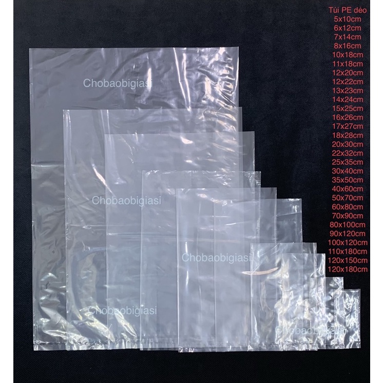 Chobaobigiasi chuyên cung cấp túi PE dẻo, túi nước lèo đủ size, chất liệu PE trong - dẻo - dai - trơn bóng - hơi mờ (Không trong suốt như chất liệu PP kiếng)- THÔNG TIN SẢN PHẨM: