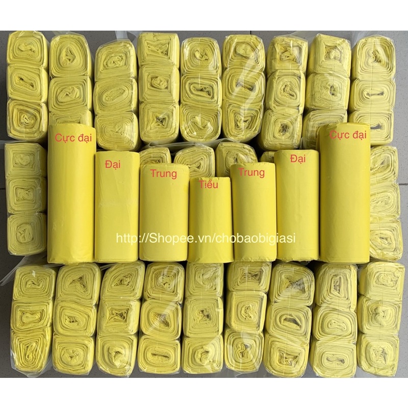 - Chobaobigiasi (CBB) chuyên cung cấp túi rác cuộn màu vàng không lõi được đóng thành từng cuộn nhỏ mỗi cuộn cỡ 300gr, và được đóng thành một bao với khối lượng 1kg, có sẵn 4 kích thước như:+ Tiểu vàng (44*56)cm: 65 cái/ kg +- 5 cái, Dùng cho thùng rác 15 lít