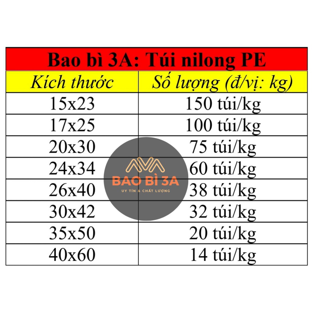 + Kích thước túi nilong PE: Chiều ngang x Chiều dài ( tính toàn bộ túi), đ/vị: cm.