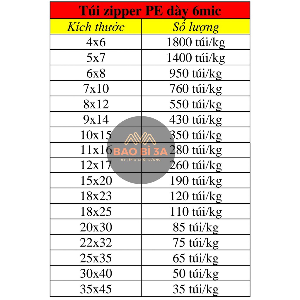 - Túi zip mỏng nhẹ thì sẽ nhiều túi hơn túi zip dày nặng, nên tùy từng chất túi mỗi đợt hàng thì số lượng cũng khác nhau. Số lượng trên bảng size chỉ là ƯỚC LƯỢNG, trên thực tế có thể chênh lệch.