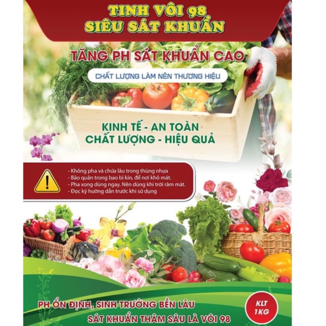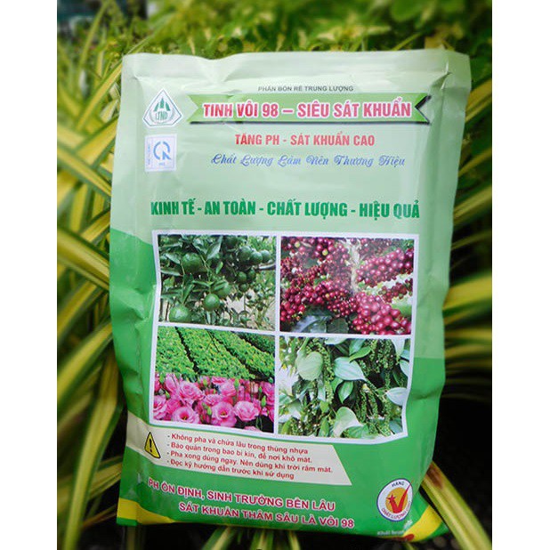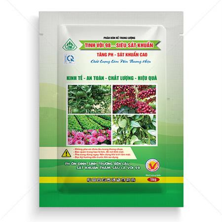 Tinh Vôi 98 Siêu Sát Khuẩn có thành phần chính là CaO và 1 số phụ gia đặc biệt. Ttinh vôi giúp cải tạo đất, hạ phèn, khử chua, ổn định độ pH trong suốt mùa vụ, khử trùng, phòng ngừa một số bệnh do nấm gây ra cho tiêu, cam, quýt... cũng như tất cả các loại cây trồng. Ngoài ra, tinh vôi còn có tác dụng ủ phân xanh, phân chuồng, giải độc cho đất, tạo dung dịch Booc đô, trung hòa axit hữu cơ và chuyển hóa gluxit, giúp cây dễ dàng chuyển hóa và hấp thụ dinh dưỡng...