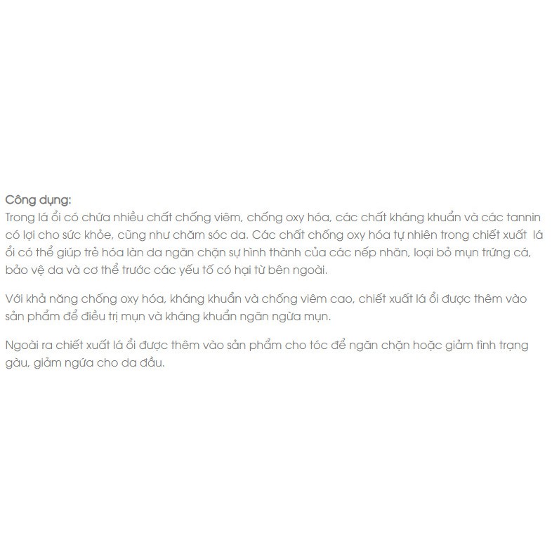Chiết xuất ổi thường sử dụng trong các công thức phối trộn thuần thiên nhiên, quảng cáo không sủ dụng chất bảo quản nhưng vẫn an toàn