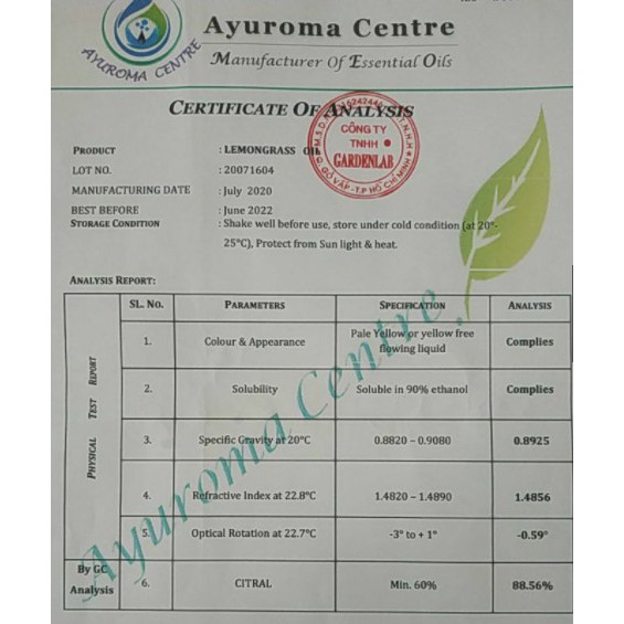 Danh pháp quốc tế: Lemongrass essential oilThông số kỹ thuật: