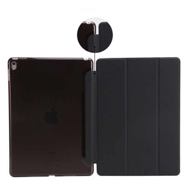 Nắp đậy được xẻ 2 rãnh để tấm đậy có thể gập quận hình tam giác, đồng thời còn được gắn nam châm có thể hút phần ốp lưng để dựng ipad chắc chắn hơn. Ngoài ta nam châm từ còn có chức năng auto tắt mở màn hình.