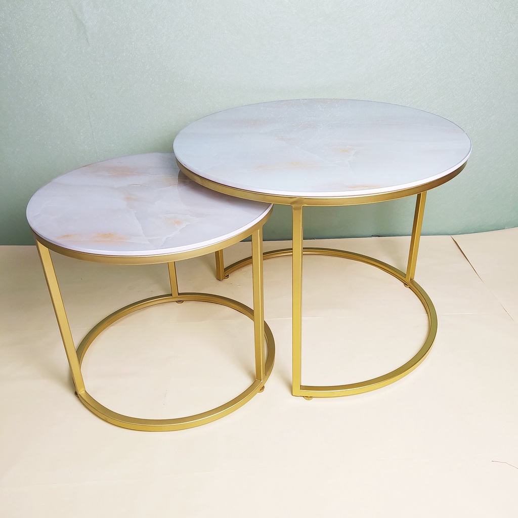 Bộ 2 bàn Sofa mặt đá khung sắt sơn được thiết kế với bộ 2 bàn có thể lồng vào nhau mà cách gọi dân dã nhiều là Bàn Mẹ Bồng Con. Bàn sofa được hoàn thiện bởi mặt bàn bằng kính cường lực kết hợp với khung sắt sơn tạo sự ấn tượng độc đáo cho người sử dụng. Bộ gồm 2 bàn với 2 kích thước lớn nhỏ có thể lồng vào nhau, phù hợp sử dụng trong phòng khách gia đình.Chất liệu: Sắt sơn tĩnh điện màu đen hoặc vàng, Mặt kính cường lực 10mm, Đế chân tăng chỉnh cao su.