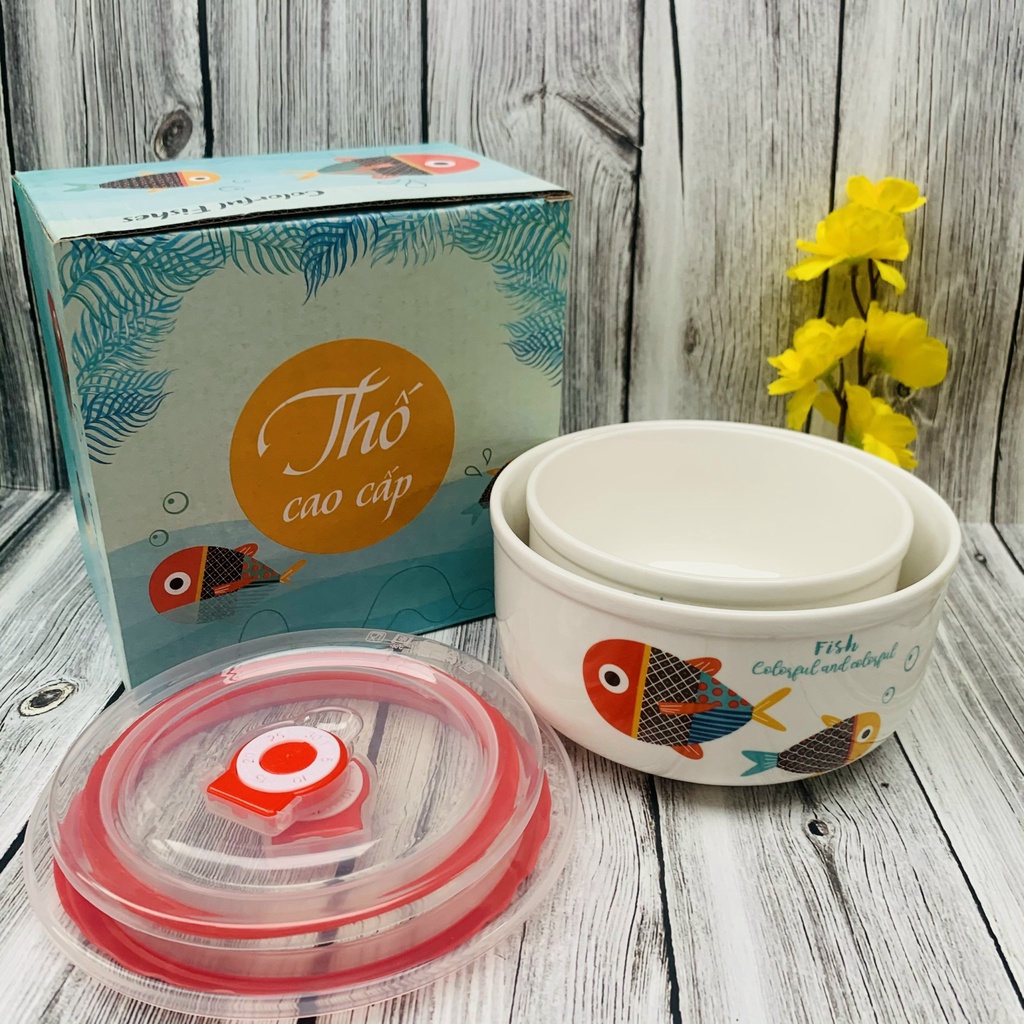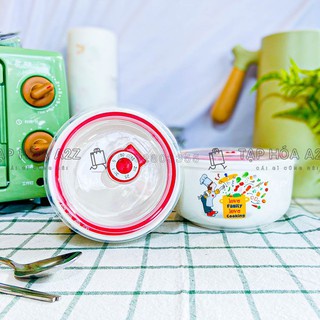 Bộ 2 Bát tô thố có nắp hút chân không bằng sứ trắng mịn in họa tiết vui tươi