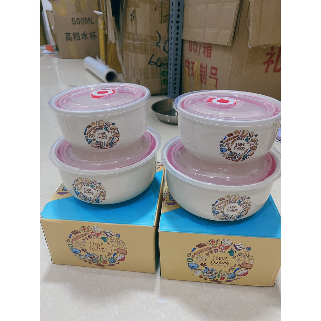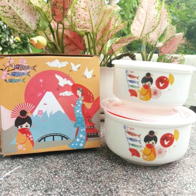Giới thiệu Bộ 2 Bát tô thố có nắp hút chân không bằng sứ trắng mịn in họa tiết vui tươi