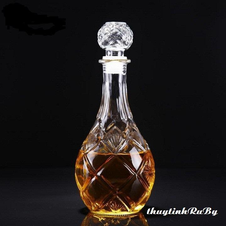 Bình ruou sâm kiểu dáng tinh tế hình thoi thẳng đứng, khắc hoa văn kim cương, có nắp vặn thủy tinh hình khối họa tiết kim cương trong suốt rất sang trọng.