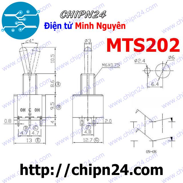 Công tắc bật 2 nấc 6 chân, màu xanh MTS202 6A/125VACThông số kỹ thuật: