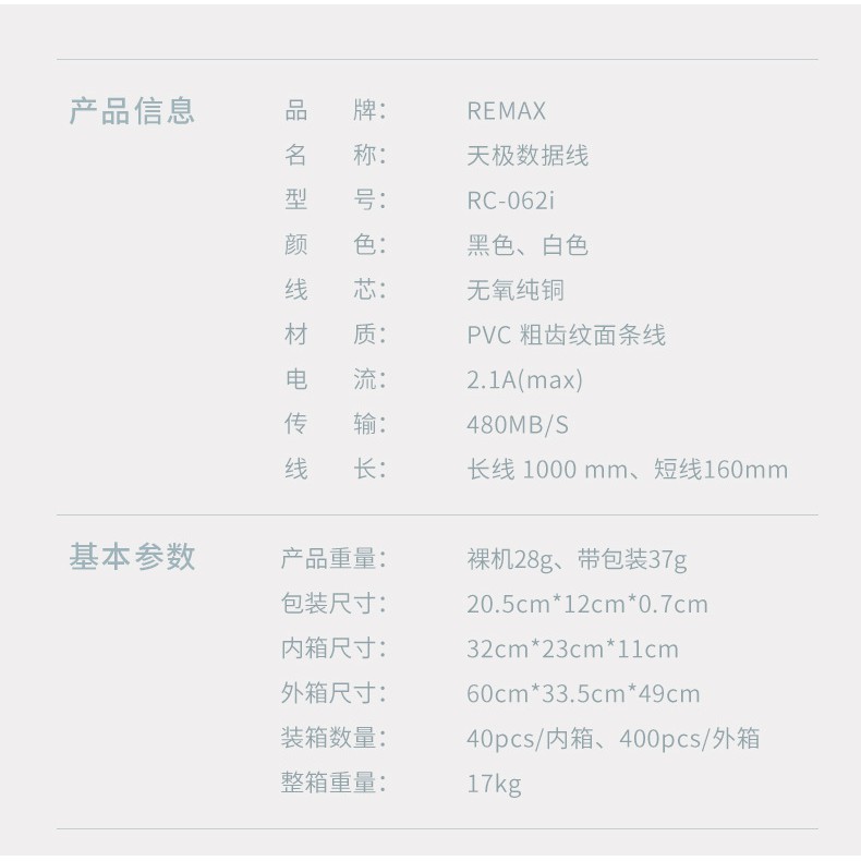 Cáp sạc đang trở thành 1 món phụ kiện không thể thiếu của bất kỳ dân công nghệ nào, đặc biệt là các bạn có đam mê dành cho smartphone, biệt được điều đó nên Remax đã cho rất nhiều loại dòng cáp sạc khác nhau, trong đó có cáp Remax RC-062i đầu lightningThông số cáp RC-062i: