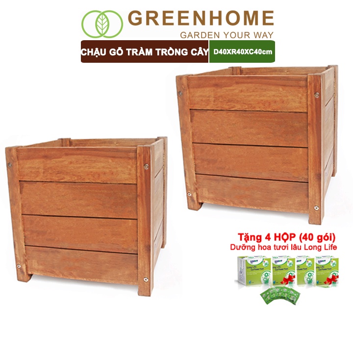 Nhà cửa & Đời sống > Làm vườn > Chậu cây || Bộ 2 Chậu gỗ trồng cây, hình vuông, D40xR40xC40cm, gỗ Tràm chịu nước, tặng 4 hộp dưỡng hoa tươi lâu |GreenhomeCòn hàng