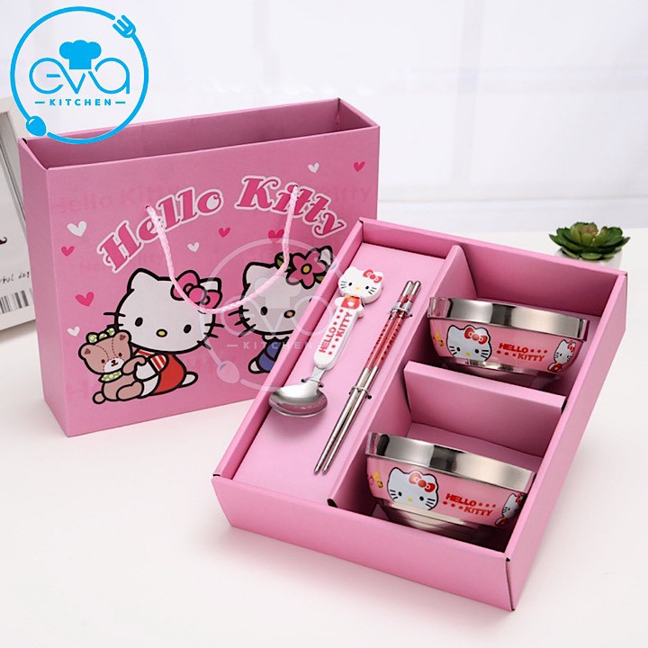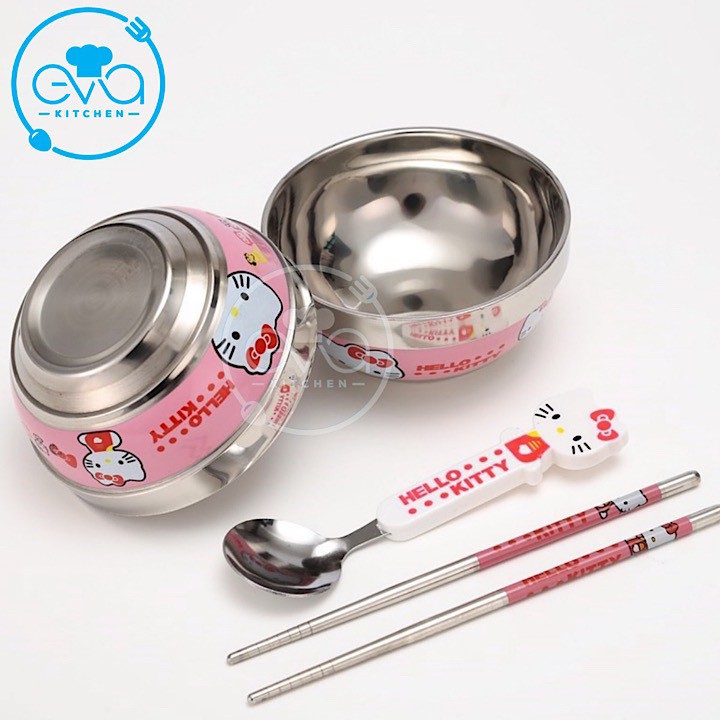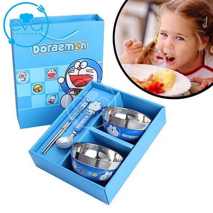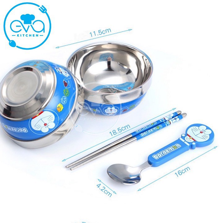 - Công Dụng : Bộ bát, đũa, thìa hình Hello Kitty và Doremon ngộ nghĩnh, dễ thương.Giúp bé thích thú với bữa ăn, ăn ngon và ăn nhiều hơn.