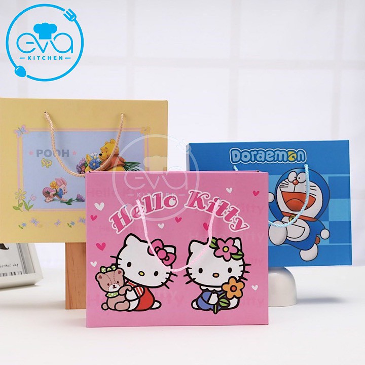 - Bộ bát, đũa, thìa hình Hello Kitty và Doremon ngộ nghĩnh, dễ thương kích thích bé ăn nhiều và ăn ngon miệng hơn.