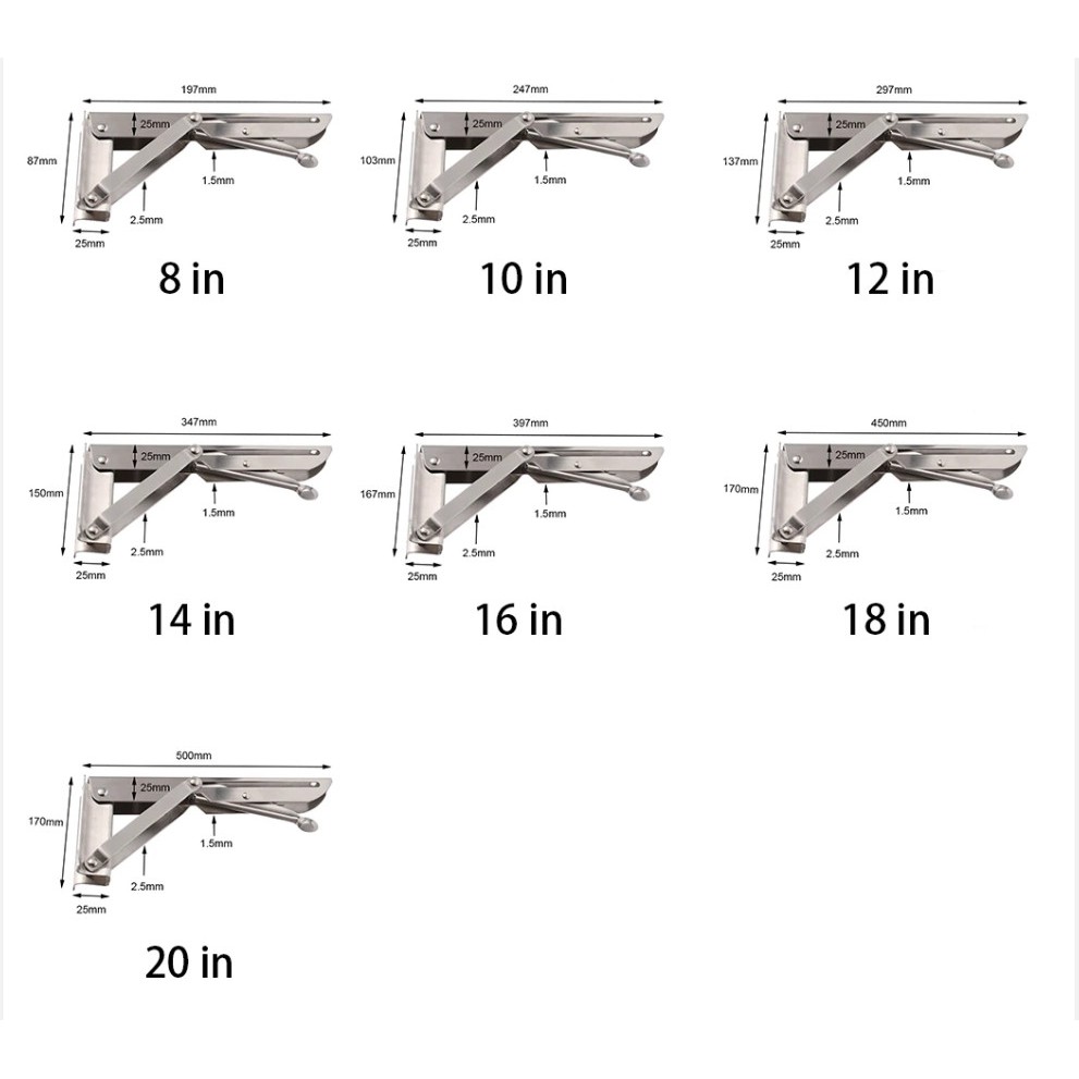 Giới thiệu Bộ 2 chiếc ke đỡ gập sát tường dài 20 đến 50cm tiết kiệm diện tích chất liệu inox và thép chịu lực 85kg