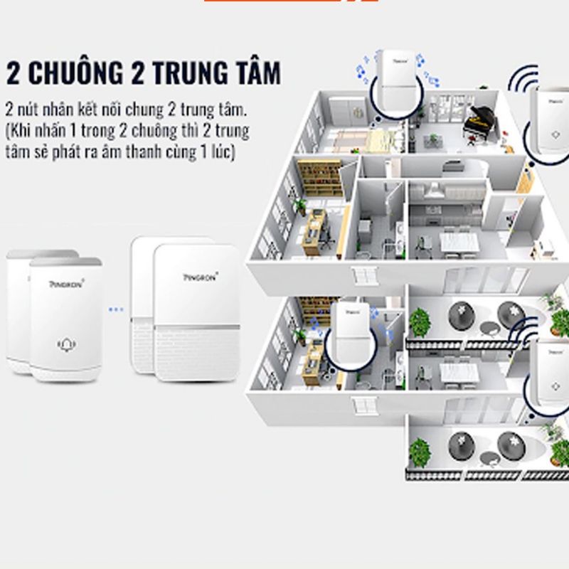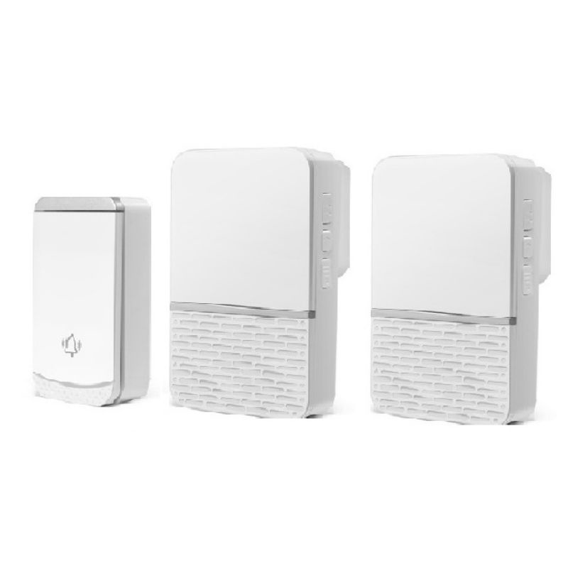 - Gồm 1 chuông và 1 nút bấm, giao tiếp không dây, hỗ trợ 36 kiểu chuông, 4 mức âm lượng