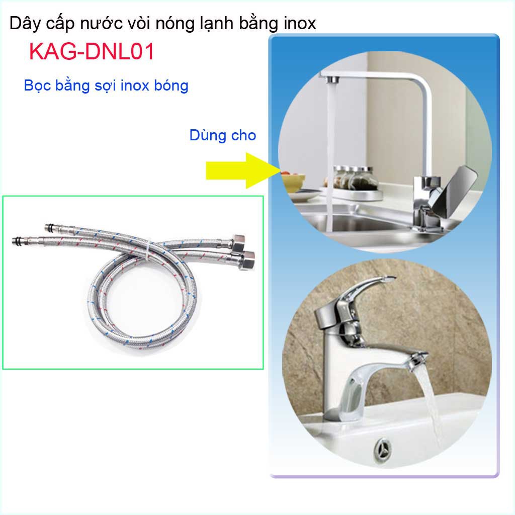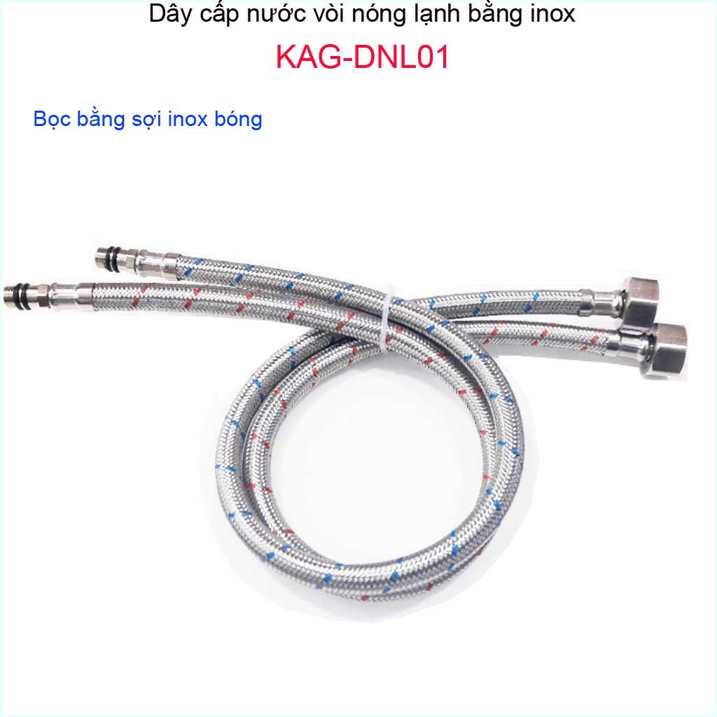 Bộ 2 dây cấp vòi nóng lạnh, dây cấp nước nóng lạnh inox KAG-DNL01Chất liệu: Bộ 2 dây cấp vòi nóng lạnh, dây cấp nước nóng lạnh inox KAG-DNL01 được bao bên ngoài lớp inox, ruột dây chịu nhiệt, dây cấp dùng kết nối dẫn nước giữa ống chờ trong hệ thống nước âm tường và vòi lavabo, vòi chậu rửa chén bát.