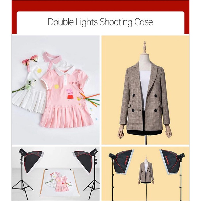 Bộ sản phẩm bao gồm: 2 đèn DE-250; 2 softbox 50x70cm ; 2 chân đèn 2.6m; 1 Trigger TR-A3