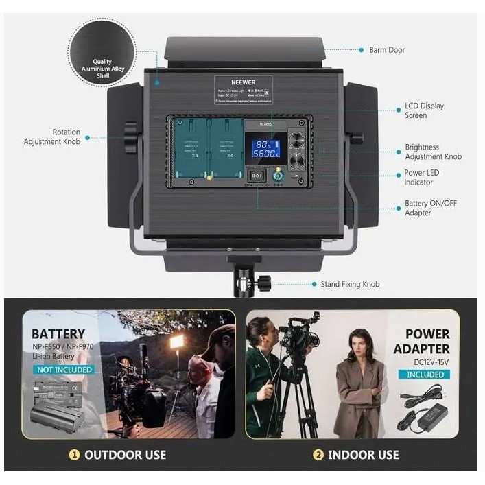 Bộ 2 đèn led Bi-color Neewer NL660S được thiết kế từ hợp kim nhôm cao cấp với 660 chip led SMD chất lượng cao ( bao gồm 330 bóng trắng, 330 bóng vàng), chỉ số CRI >96+, dải nhiệt độ màu từ 3200K – 5600K. Neewer NL660S có màn hình LCD hiển thị phía sau giúp thể hiện thông số công suất, nhiệt độ màu, mức pin… một cách rõ ràng trực quan nhất. Ngoài ra đèn led quay phim NL660S còn được thiết kế 2 gá pin NP giúp quay phim chụp ảnh ở những nơi không có nguồn điện trực tiếp.THÔNG SỐ KỸ THUẬT: