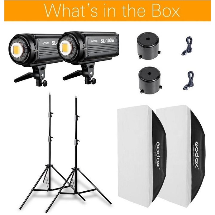 Bộ sản phẩm bao gồm: 2 đèn Godox SL-100W; 2 softbox 60x90cm ; 2 chân đèn, 2 dây nguồn.