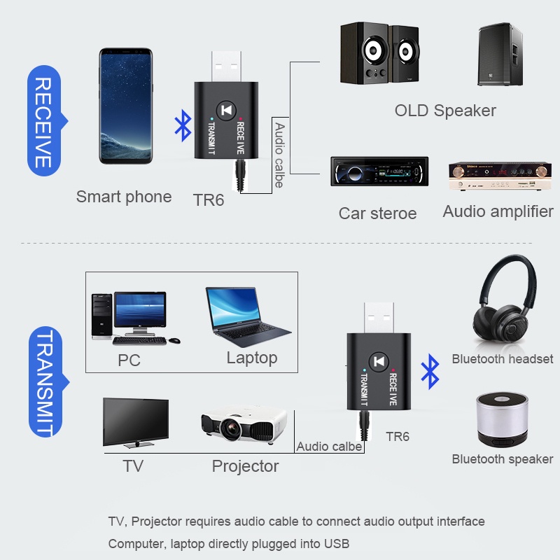[2 IN 1 Adapter] Bộ Chuyển Đổi Phát Và Nhận Âm Thanh Bluetooth TR, Cho Laptop, PC, Loa, Xe Ôtô