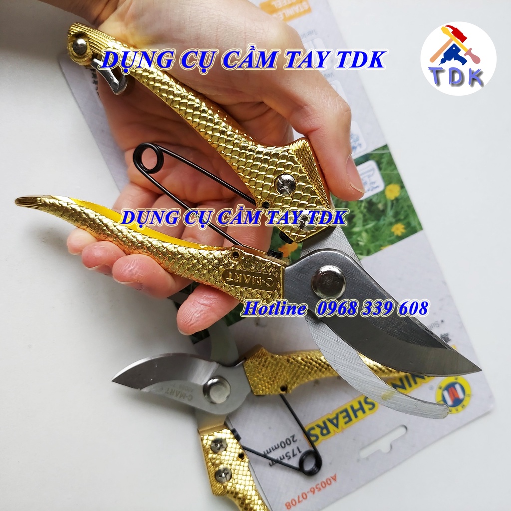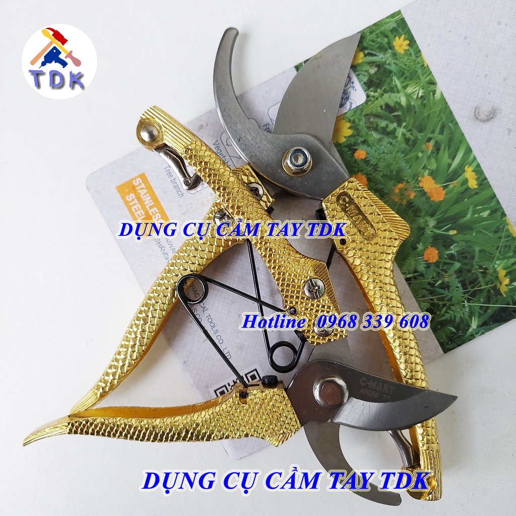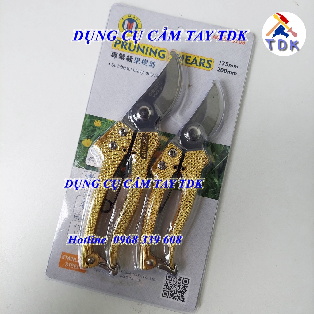 Bộ 2 kéo cắt cành lưỡi thép không gỉ C-Mart, cán vẩy rồng vàng A0056-0708Kéo cắt cành vẩy rồng C-Mart là một chiếc kéo bền, lưỡi kéo được chế tạo bằng thép không gỉ, có độ cứng cao, được xử lý nhiệt đặc biệt, đảm bảo độ sắc bén, đường cắt chính xác.