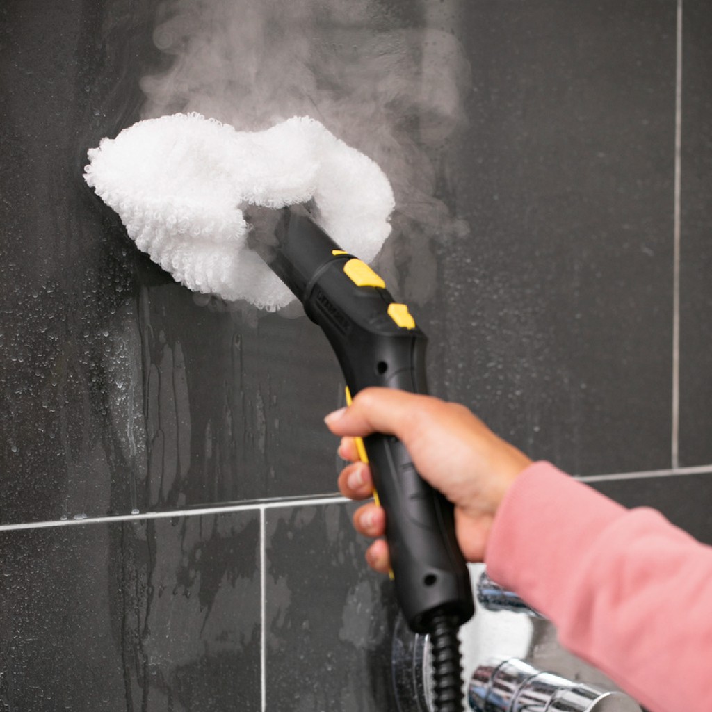 - Khăn lau Karcher tích hợp dây đàn hồi giúp dễ dàng tháo lắp với đầu phun cầm tay của máy làm sạch bằng hơi nước nóng karrcher SC.